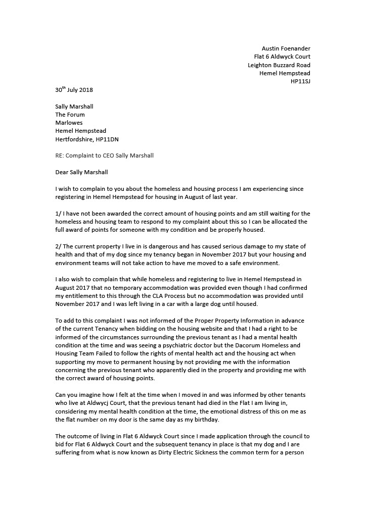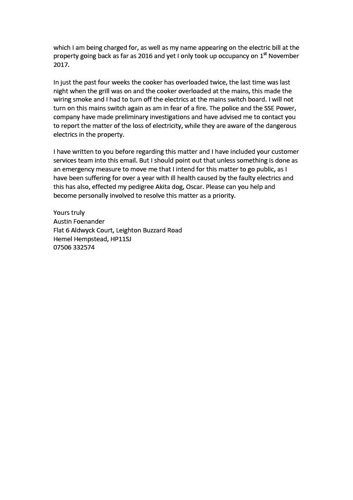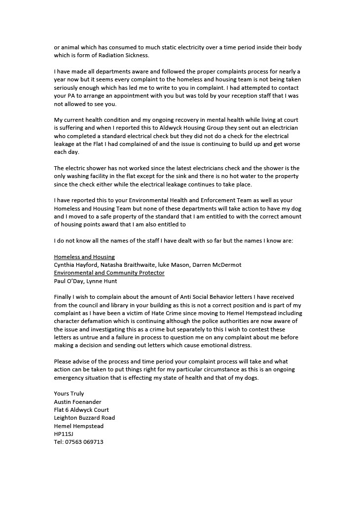 In early 2018 Mr Foenander lodged complaints about the dangerous electrical issue effecting his health with the Aldwyck Housing Group CEO Ian McDermott, the CEO of Dacorum Borough Council, his GP’s and Mental health team and even the local MP MIke Penning but instead of arranging immediate re-housing and treatment for the radiation sickness he was suffering with my companion dog, Oscar, an illegal eviction strategy was implemented.