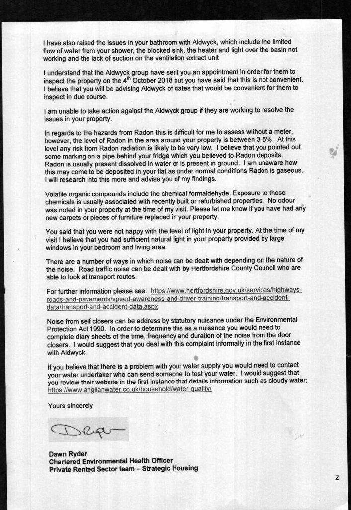 Eventually after 8 months of complaints the local EHO Dawn Ryder who visited the flat to do an inspection. Dawn Ryder did not have the correct equipment to do the HHSRS Hazard Checks required, including for electrical hazard, internal damp and the radon gas complaint, that was leaking into the kitchen through the air vents. Dawn Ryder never returned to finish the assessment and went on to Lie and avoid questions around her failing to score the Category 1 Electric Hazard in the flat by using the NICEIC scoring system for her initial reports and not the HHSRS process scoring system that she had been trained and should have used. The same tactic was used by her head of department Neil Polden who deliberately refused to reply to direct questions put to the council by Alex Mayer (MEP) Labour.